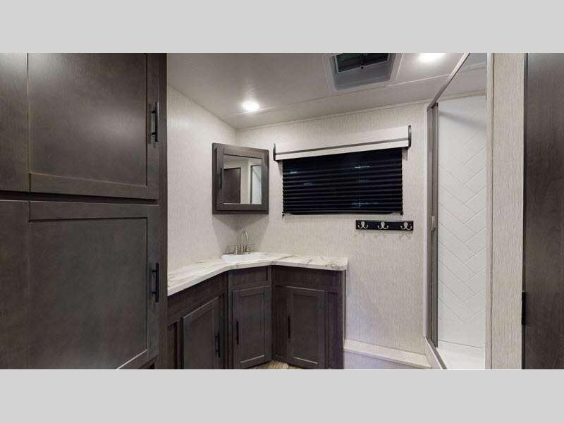 Sleeps 6 Slides 2 Length 34 ft 11 in Ext Height 11 ft 4 in Interior Color Breezy Beige, Granite Gray Hitch Weight 830 lbs Dry Weight 7192 lbs Fresh Water Capacity 54 gals Grey Water Capacity 60 gals Black Water Capacity 30 gals Furnace BTU 30000 btu Available Beds King Refrigerator Type 12V Refrigerator Size 10 cu ft Cooktop Burners 3 Shower Size 30" x 36" Number of Awnings 1 LP Tank Capacity 20 lbs Water Heater Type Girard On Demand Gas TV Info LR TV Lift Awning Info Power with LED Lights Axle Count 2 Washer/Dryer Available Yes Number of LP Tanks 2 Shower Type Standard Similar Floorplans