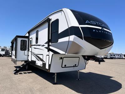 Each one of these Dutchmen RV Astoria Platinum fifth wheels feature a fiberglass exterior for added durability and an All Weather Thermal Package so you can camp all year long! There are also MorRyde Solid entry steps, slam latch baggage doors, and many more exterior conveniences. You'll enjoy a 200W solar panel for off-grid capabilities, slam latch baggage doors, and a power awning with LED lights for an inviting outdoor space. The interior is designed with bathroom backsplash, night shades throughout the living area, and Thomas Payne furniture collection. The on-demand tankless water heater will provide endless hot showers, and the dual ducted A/C will keep you cool all summer long.