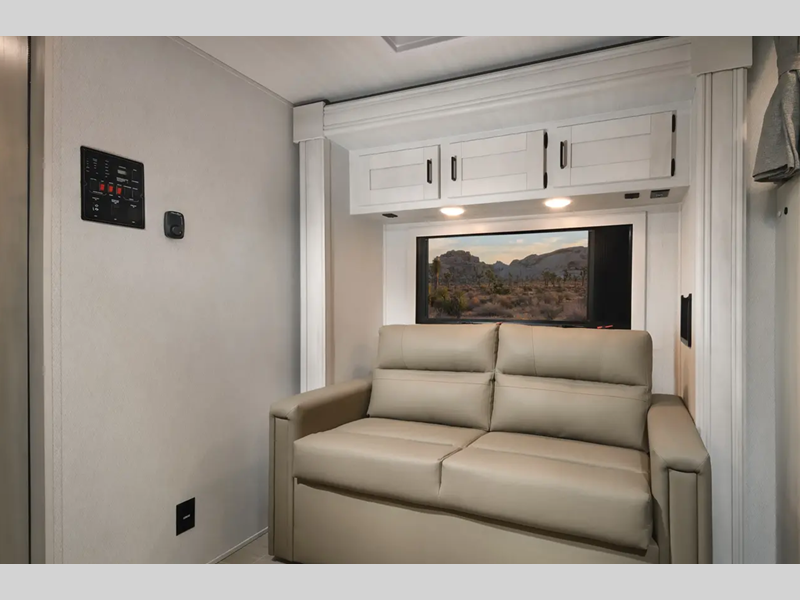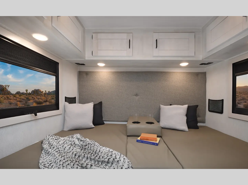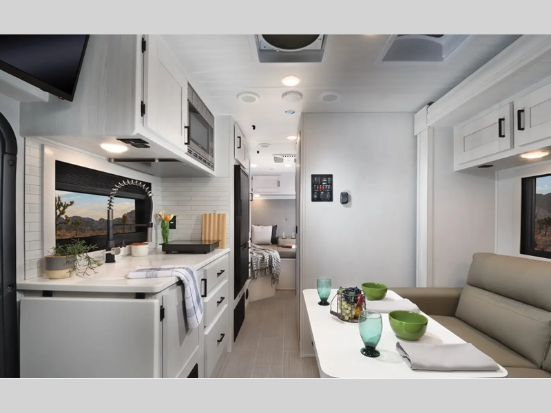 You will find plenty of space inside with overhead cabinets throughout, plus added roominess thanks to a slide and cabover bunk which can always double as storage space if you don't need it for sleeping. For food storage, a 12 volt refrigerator, plus there is a cooktop and convection microwave oven for quick and easy meals while on the road. A solid surface countertop with extension for meal prep is handy as well.