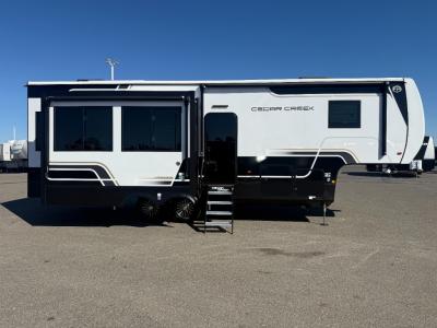 With any Cedar Creek Experience fifth wheel by Forest River, you will bet met with luxury features both inside and out! The True Gelcoat exterior is the best of the best in exteriors and the 3M bonded sidewalls will hold up over years of use. There is also a new 101'' wide-body frame, a Road Warrior suspension, plus a TST tire pressure monitoring system to make towing that much easier. You will find a hidden front storage compartment, along with a 4' x 6' ABS, ribbed, removable underbelly panels, and 6-point hydraulic leveling system, plus many more exterior conveniences. The interior will have you feeling like you haven't left home with vinyl floor coverings, power theater seating with USB ports, a cozy fireplace, vinyl floor covering and the list of comforts goes on! Each model is also pre-wired for satellite to the roof, and you're sure to never go bored with a Smart TV in the bedroom!