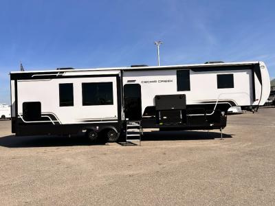 With any Cedar Creek fifth wheel by Forest River, you will find a quality-built RV with your comfort in mind! The all-aluminum super structure on 16" centers or less will provide a solid foundation to your fifth wheel, and the 3M bonded sidewalls will hold up and provide resistance to UV, heat, cold moisture, and even highway chemicals. Each model also includes a Road Warrior suspension for smooth towing, a 6-Point Hydraulic ,GEN 3 Leveling System, and a new 101" wide body frame. Inside, you'll enjoy walnut/two tone wooden cabinetry with hidden hinges, cutting board drawer with cut-out trash funnel, motion lighting in the bath and bedroom closet, plus many more comforts. The New Travelfi™ Pay-as-you go internet provides the ability to bring your own internet rather than relying solely on campground WiFi, and the "Rich Solar" 200W solar panel will give you off-grid capabilities!
