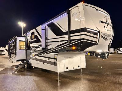 The Forest River RiverStone fifth wheels and toy haulers are super luxurious and convenient for all your camping or full-time needs! These elegant units have standard features that will enhance every aspect of your trip, like a cordless vacuum, 18-cubic foot French door refrigerator with an ice maker, an under-bed storage compartment, and hydraulic slide outs.