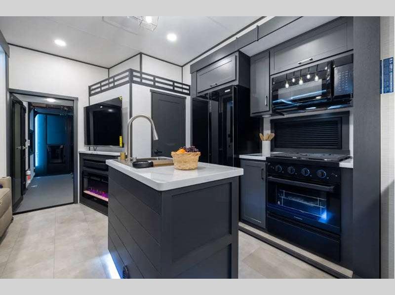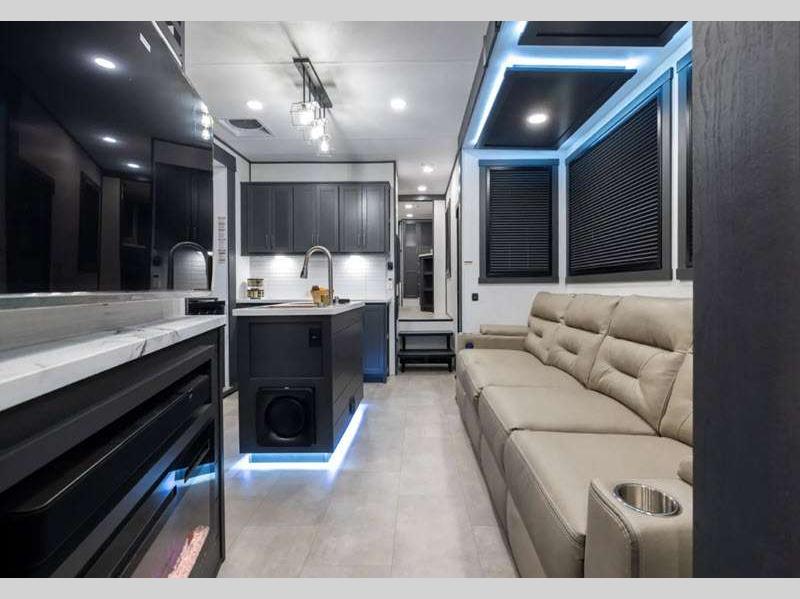 Sleeps 8 Slides 3 Length 41 ft 9 in Ext Width 8 ft 6 in Ext Height 13 ft 5 in Hitch Weight 3320 lbs GVWR 17320 lbs Dry Weight 14254 lbs Cargo Capacity 3066 lbs Fresh Water Capacity 150 gals Grey Water Capacity 110 gals Black Water Capacity 98 gals Tire Size 16" Generator 6.0 NPS Fuel Capacity 40 gals Number Of Bunks 1 Available Beds King Refrigerator Type 12V Residential Style Refrigerator Size 16 cu ft Cooktop Burners 3 Shower Size 24" x 36" Number of Awnings 1 Garage Size 15 ft LP Tank Capacity 30 lbs Water Heater Type Tankless AC BTU 54000 btu TV Info LR Large TV Awning Info 14' Electric w/LED Lights Axle Count 2 Number of LP Tanks 2 Shower Type Tub/Shower Combo Electrical Service 50 amp Solar Wattage 200 watts Similar Floorplans