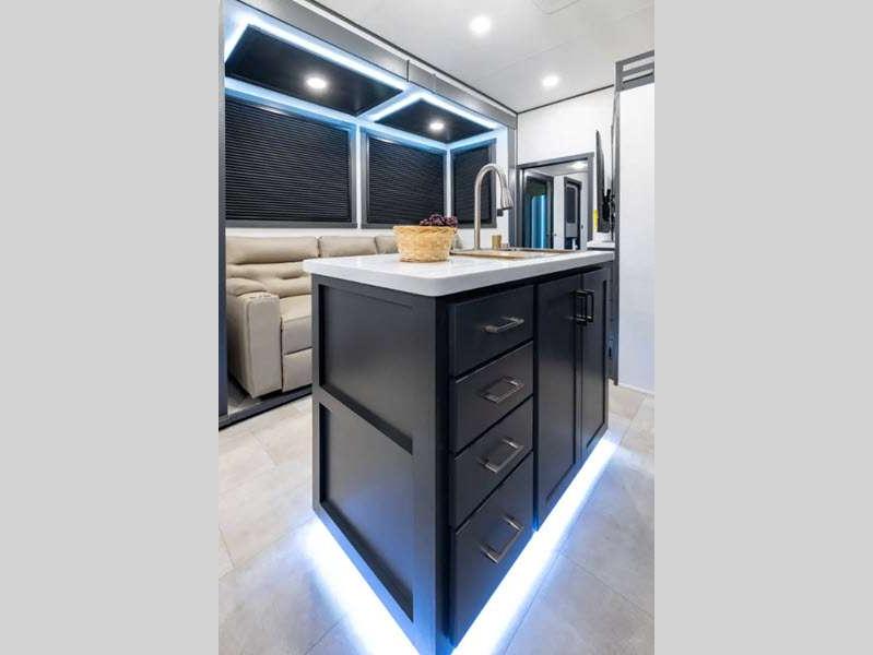 Sleeps 8 Slides 3 Length 45 ft 11 in Ext Width 8 ft 6 in Ext Height 13 ft 5 in Hitch Weight 3360 lbs GVWR 21000 lbs Dry Weight 15749 lbs Cargo Capacity 5251 lbs Fresh Water Capacity 150 gals Grey Water Capacity 120 gals Black Water Capacity 32 gals Tire Size 16" Generator 6.0 NPS Fuel Capacity 40 gals Number Of Bunks 1 Available Beds King Refrigerator Type 12V Residential Style Refrigerator Size 16 cu ft Cooktop Burners 3 Shower Size 24" x 48" Number of Awnings 3 Garage Size 14 ft LP Tank Capacity 30 lbs Water Heater Type Tankless AC BTU 54000 btu TV Info LR TV Awning Info 11', 12', 12' Electric w/LED Lights Axle Count 2 Washer/Dryer Available Yes Number of LP Tanks 2 Shower Type Standard Electrical Service 50 amp Solar Wattage 200 watts Similar Floorplans
