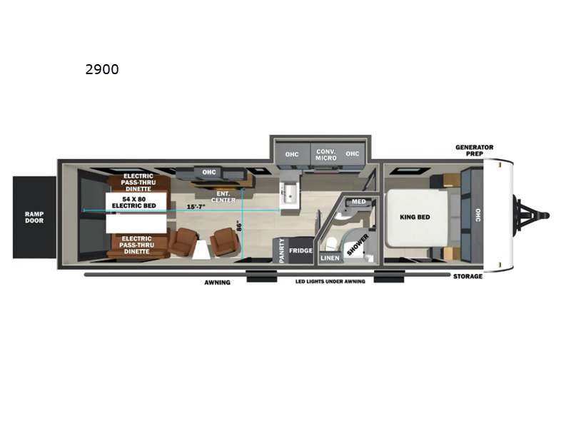 This dual entry travel trailer is sure to meet all your needs. Once you arrive at the campground, unload your toys from the 15' 7" total garage space, then grab a cold drink from the refrigerator. You can then relax on the dual lounge chairs, play a game at the electric pass-thru dinette, or let your guests rest on the electric bed. If you need a rest yourself, you'll find the king bed in the front master bedroom ultra comfortable. This model also includes an entertainment center with a fireplace and a kitchen slide out with the sink, counter space, cooktop, and pantry!