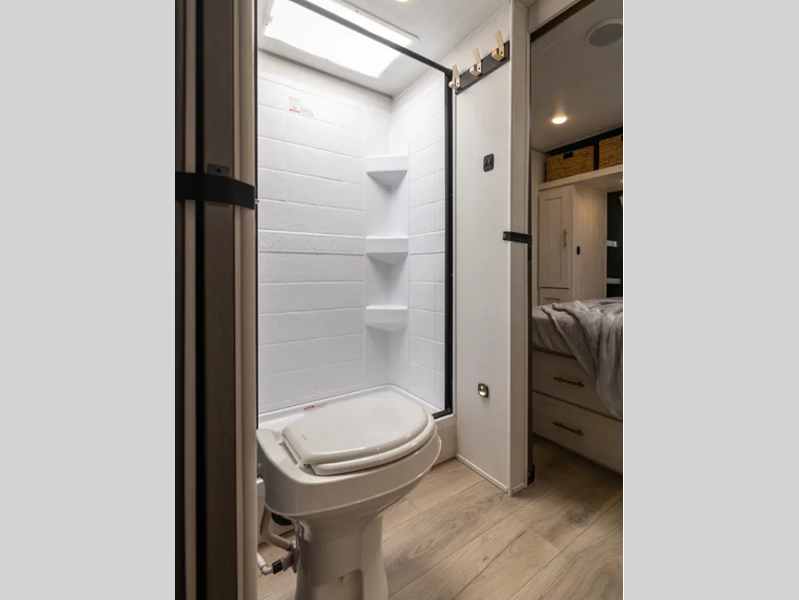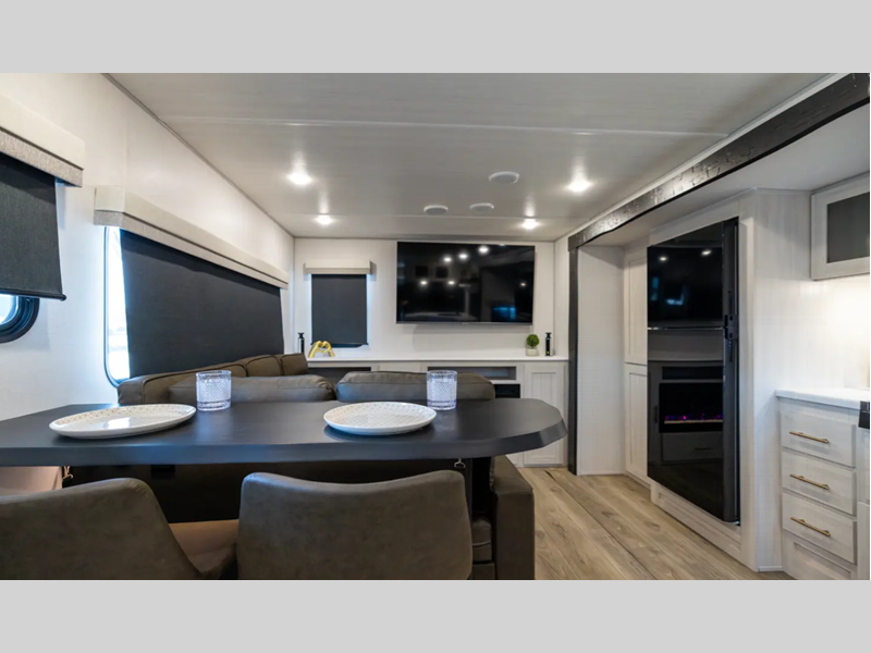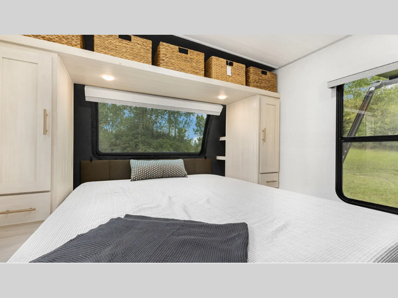 The aluminum framed floor with block foam insulation ensures exceptional structural integrity and thermal efficiency for comfortable travels in diverse climates, along with the sealed underbelly with forced heat & radiant foil barrier that provides superior insulation and heat management, ideal for chilly nights or cooler regions. Inside, you will find seamless Surf-X kitchen countertops that offer a sleek, durable surface and are easy to maintain for busy travelers. Further, the blackout roller shades will add privacy and light control for restful nights and cozy daytime retreats.
