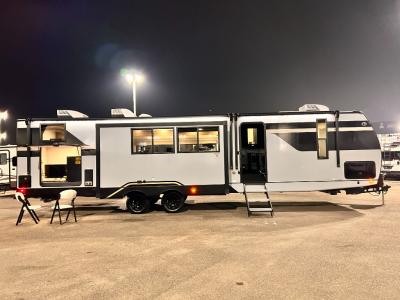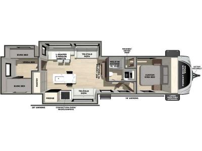 Sleeps 9 Slides 3 Length 39 ft 10 in Ext Width 8 ft Ext Height 11 ft 4 in Hitch Weight 1195 lbs Dry Weight 8933 lbs Cargo Capacity 2462 lbs Fresh Water Capacity 39 gals Grey Water Capacity 106 gals Black Water Capacity 30 gals Number Of Bunks 2 Available Beds Custom King, Versa Queen Refrigerator Type 12V Refrigerator Size 10.7 cu ft Cooktop Burners 3 Shower Size 36" x 30" Number of Awnings 1 Water Heater Type On Demand Tankless AC BTU 31500 btu TV Info LR TV Awning Info 20' w/LED Lights Axle Count 2 Washer/Dryer Available Yes Shower Type Standard Similar Travel Trailer Floorplans