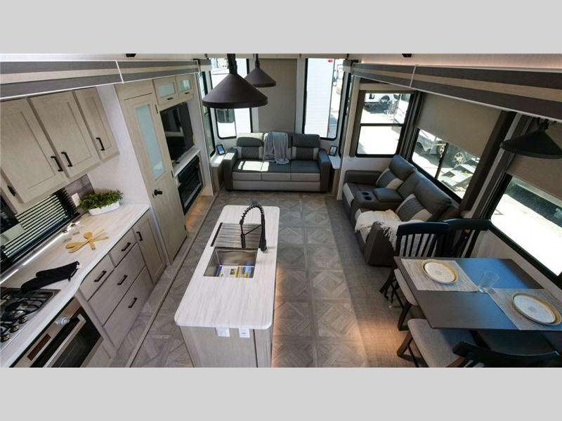 Sleeps 8 Slides 2 Length 44 ft 11 in Ext Width 8 ft 5 in Ext Height 13 ft 4 in Hitch Weight 1485 lbs Dry Weight 14404 lbs Cargo Capacity 2400 lbs Fresh Water Capacity 40 gals Grey Water Capacity 80 gals Black Water Capacity 80 gals Available Beds King with Versa Tilt, Versa Queen, Versa Queen Mattress Cooktop Burners 4 Number of Awnings 1 Water Heater Type On Demand Tankless TV Info LR Televator Awning Info with 4K Blade Lighting Axle Count 2 Washer/Dryer Available Yes Shower Type Walk-In Shower Similar Floorplans