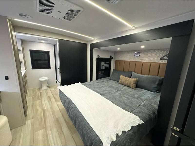 Sleeps 2 Slides 2 Length 31 ft 8 in Ext Width 8 ft Ext Height 11 ft 6 in Hitch Weight 1020 lbs Dry Weight 7563 lbs Cargo Capacity 2257 lbs Fresh Water Capacity 45 gals Grey Water Capacity 60 gals Black Water Capacity 30 gals Available Beds Custom King Refrigerator Type 12V Refrigerator Size 10 cu ft Cooktop Burners 3 Number of Awnings 1 Water Heater Type On Demand Tankless AC BTU 18000 btu TV Info 40" LED Smart TV Awning Info 22' with LED Lights Axle Count 2 Washer/Dryer Available Yes Shower Type Walk-In Shower Electrical Service 50 amp Similar Floorplans