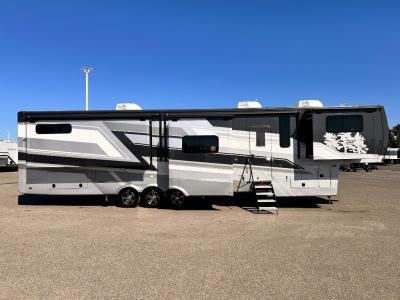 Throughout the interior you'll find residential carpet/linoleum and USB ports, and there is a central vacuum with power dust pan to use when messes happen. There is an iN-Command global automation system, Winegard Connect 2.0 4G/Wi-Fi, 15,000 BTU Whisper Quiet A/C, and energy-efficient 35,000 BTU furnace. You will have an exciting living area filled with a 5,100 BTU fireplace, Bluetooth sound bar with powered subwoofer, wireless charging pad, and 4K Smart HDTV. All of this luxury sits on a Custom FIT 2.0 chassis with six-point hydraulic jacks, a MORryde LRE 4100 suspension system, Falcon 8,000-LB axles, and a Falcon 2" receiver hitch rated at 3,000 pounds.
