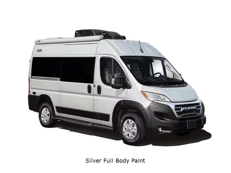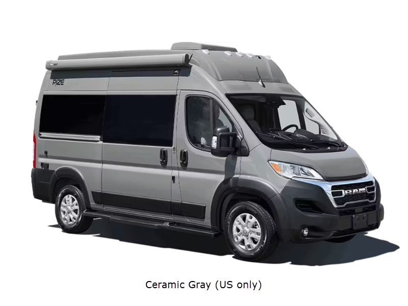 Sleeps 2 Length 17 ft 11 in Ext Width 6 ft 9 in Ext Height 9 ft 5 in Int Height 6 ft 3 in Interior Color Charcoal Fusion Exterior Color Silver, White, Ceramic Gray Hitch Weight 5000 lbs GVWR 8550 lbs Fresh Water Capacity 16 gals Grey Water Capacity 15 gals Black Water Capacity 4.75 gals Furnace BTU 14300 btu Generator 2800 Gas Fuel Type Gas Engine 3.6L Pentastar V6 Chassis RAM Promaster 1500XT Horsepower 276 hp Fuel Capacity 24 gals Wheelbase 136 in Available Beds Flip-Up Bed Torque 250 ft-lb Refrigerator Type Single Door 12V Electric Cooktop Burners 2 LP Tank Capacity 24.78 lbs Water Heater Capacity 2.64 gal Water Heater Type Combi Eco Hydronic AC BTU 11000 btu Gross Combined Weight 11500 lbs Shower Type Wet/Bath Shower Electrical Service 30 amp Solar Wattage 200 watts -