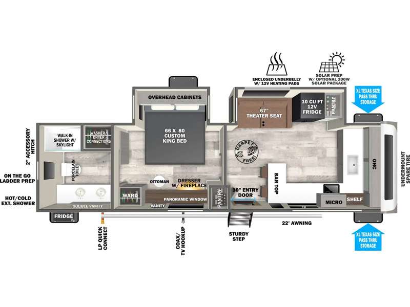 - Extra Large Pass Thru Storage w/ Slam Latch Baggage Doors