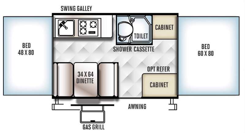 Both a booth dinette and cabinet with optional refrigerator are along the entry wall. The front wall includes a cabinet, a shower and a porta potty. You will also find a swing galley with single bowl sink, three burner range top along this wall.