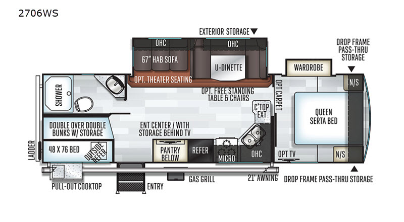 Enjoy any camping trip with this 2706WS Forest River Rockwood Ultra Lite travel trailer. The kitchen area is where you can easily create meals and snacks while on the go with a pantry big enough to store your favorite goodies! Opposite of the kitchen area, you will find a slide out with a 60" hide-a-bed sofa and an U-shaped dinette where you can enjoy your meals at or transform into an extra sleeping space. Both offer overhead cabinets to keep things tucked away and organized. The bunk beds are sure to be a pleaser with your kiddos and they will also love being right next to the rear bath, especially for those late night trips to the bathroom. There is also an outdoor kitchen so that you can enjoy the outdoors to its fullest, plus a 21' power awning with LED lights to protect you from the sun's rays!