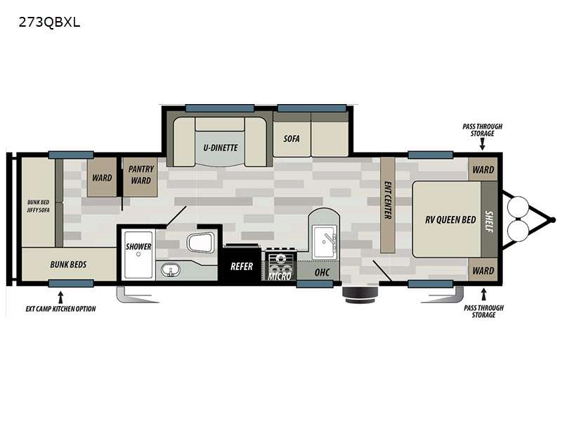 You will want each camping trip to extend just a little bit longer when you choose to camp with this Wildwood X-Lite T273QBXL. Your kids will enjoy the rear bunkhouse which has three bunk beds and a jiffy sofa below one bunk. While the chef in the family is fixing the meals you can easily visit with your family since the kitchen and living area are open and spacious with the single slide. You can enjoy your meals at the U-shaped dinette and at night this converts into an additional sleeping space. The front bedroom is ideal for mom and dad. Here they can get a good night's rest on the RV queen bed plus there is storage with the wardrobes and overhead shelf. You can also add the optional camp kitchen to enjoy the sunshine even while you cook up your best meal!